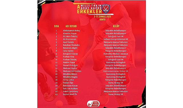 03-12 Temmuz 2025 tarihleri arasında Konya’da yapılacak kamp öncesi A Milli Erkek Hokey Takımı’nın 23 kişilik aday kadrosu Türkiye Hokey Federasyonu tarafından açıklandı.
